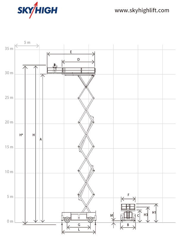 The SHS-320 E25 is a high-capacity electric scissor lift offering a maximum working height of 32m and a significant horizontal outreach of 29.7m. Designed for versatility, it features a robust 1000kg platform capacity, proportional controls, and certified operation in temperatures down to -15°C. Standard safety systems and optional 4WD/4WS enhance its suitability for demanding indoor and outdoor industrial applications.