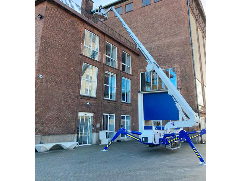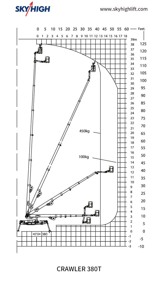The CRAWLER 380T aerial spider vehicle is a unique design with market-leading features. The CRAWLER 380T has a working height of 38 metres and a height-adjustable crawler lift.The CRAWLER 380T is the latest aerial spider truck, with a maximum load capacity of 450 kg and a working height of 38 metres, due to a sophisticated electronic and safety control system that ensures a maximum level extension of 16.5 meters. The whole boom adopts the structure of telescopic boom + small boom, which meets most of the requirements of site use; as many customers need not only to use the spider truck as an aerial work platform, but also as an auxiliary tool for aerial work installation and maintenance, so the CRAWLER 380T has the option of installing an auxiliary tray for glass to increase the functionality of the spider truck.